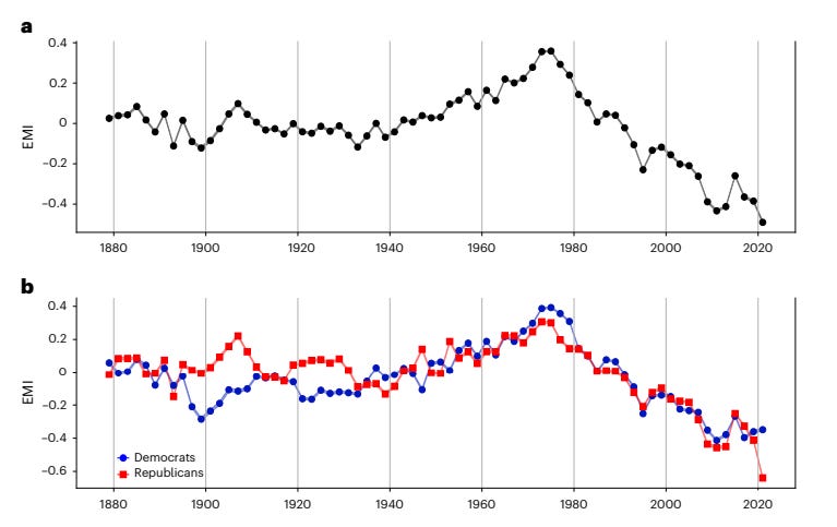 An upward trend from the 1940s culminated in a peak in the mid-1970s. The peak coincides partially with the time when Democrats had a two-thirds majority in Congress and Jimmy Carter was president. After that, EMI was in rapid decline to hit an all time low with the 2021-22 Congress, the latest analyzed by the researchers. The Congress with the most emotional rhetoric in the 144 years that the study covers. It also shows a split between the parties with Republicans currently diving much deeper into non-factual rhetoric than Democrats.